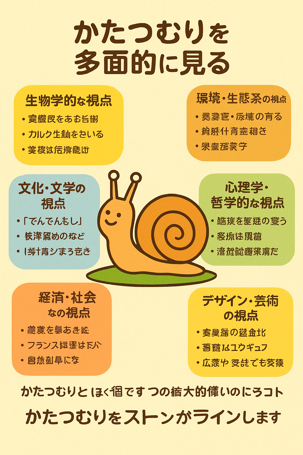 6. デザイン・芸術の視点 フォルム:殻の渦巻きは黄金比や自然の数学的美を象徴。 キャラクター性:かわいらしさ、のんびり感を演出するモチーフ。 象徴表現:ゆっくり・安全・家庭(殻=家)のイメージで広告や絵本に登場。