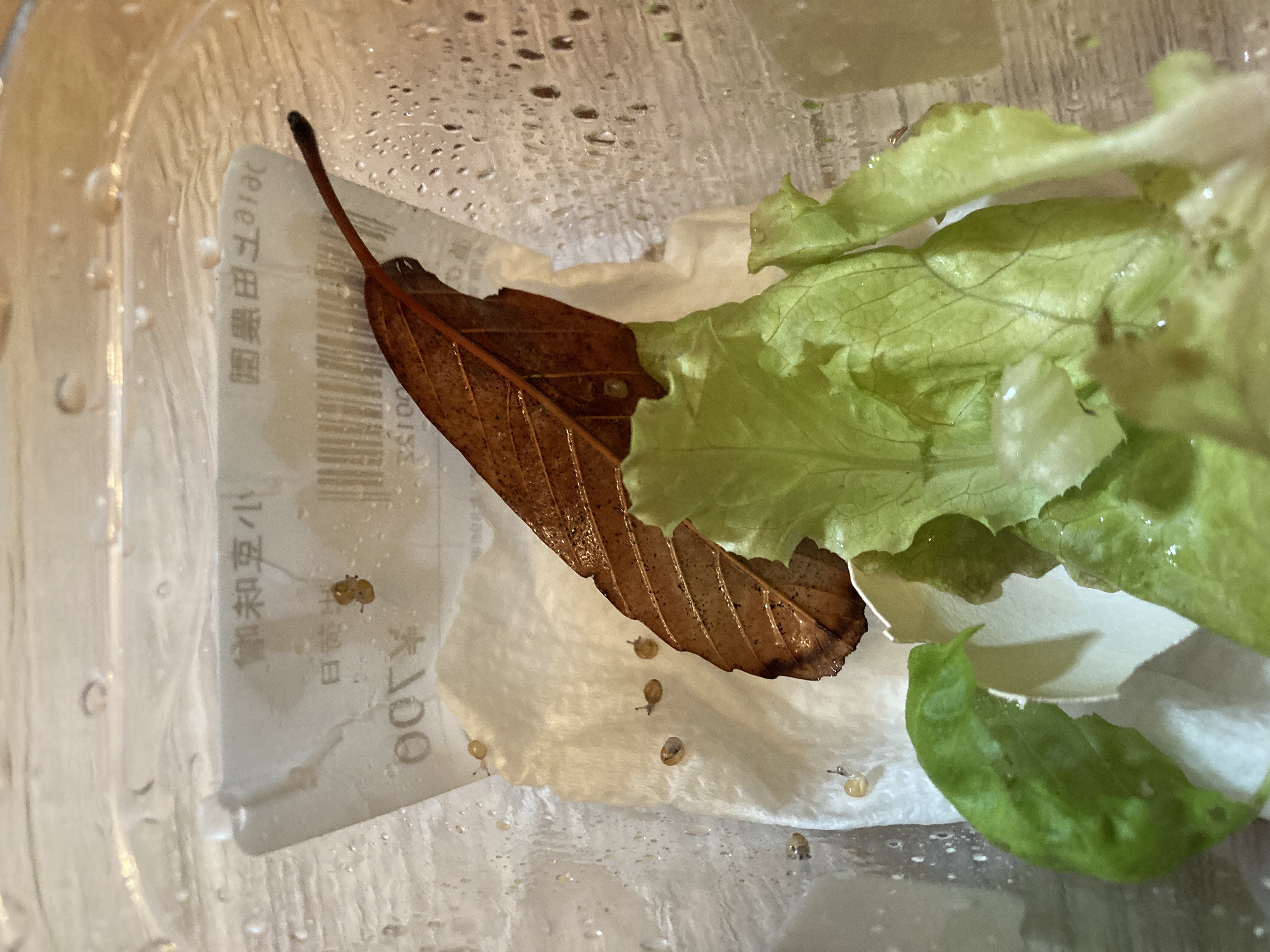 なんと10/19(宅建試験日)に全15体の卵が孵化し、見事に季節外れのベビー達が誕生しました。来月の冬眠INに備えてもりもり食べて成長中です。個別の名前は考え中ですが、「宅建ズ」と総称した呼び名としています。民法の「みん」、法令制限の「ほう」、税その他の「ぜい」てな感じでしょうかねえ。誕生したばかりの写真ですが、豆粒みたいな「宅建ズ」が分かるでしょうか。「5問免除」が一番小粒です。